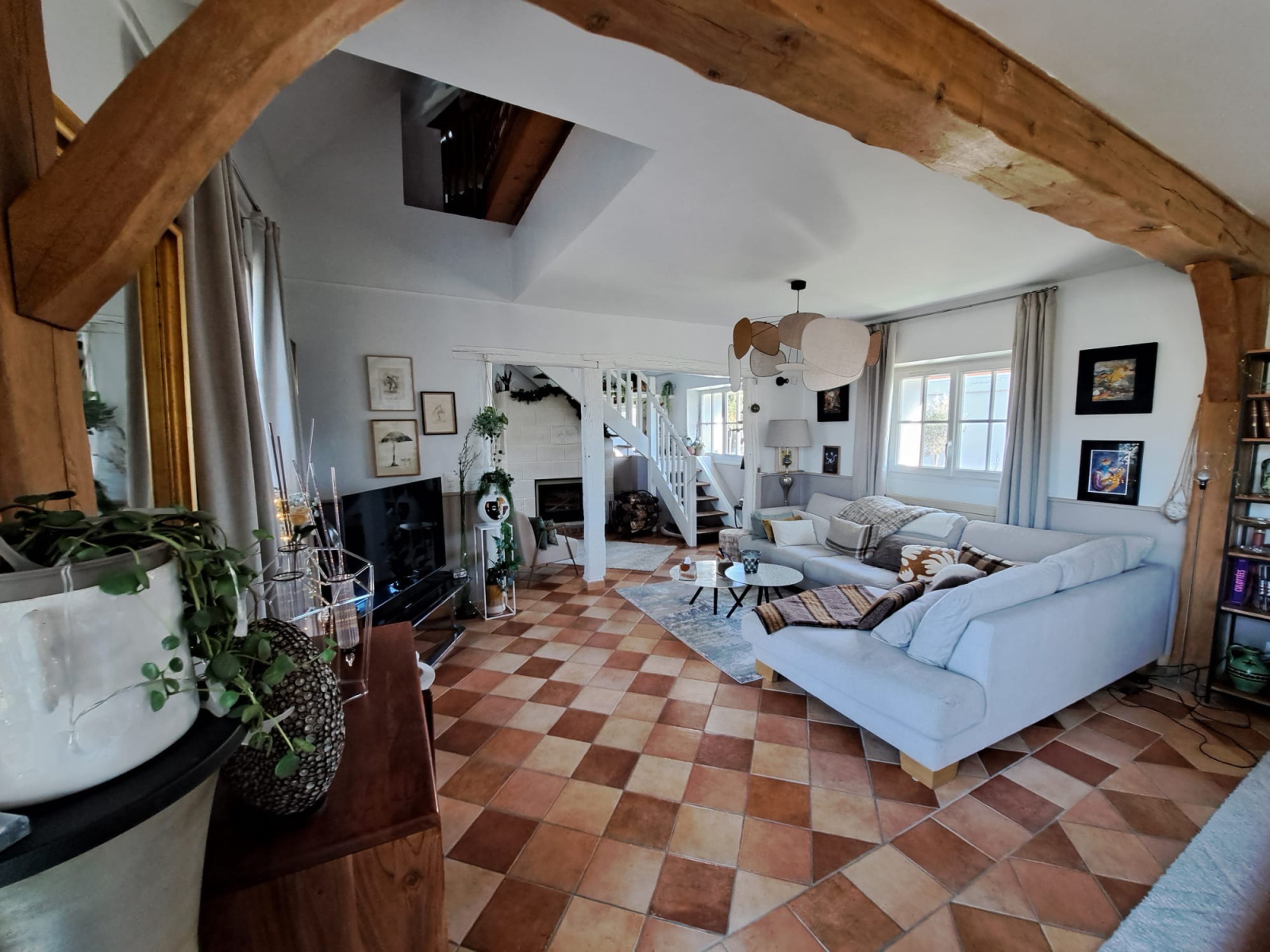 A l'étage: Mezzanine, 3 chambres, rangements, salle de bains, wc, grenier.