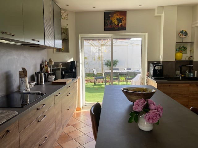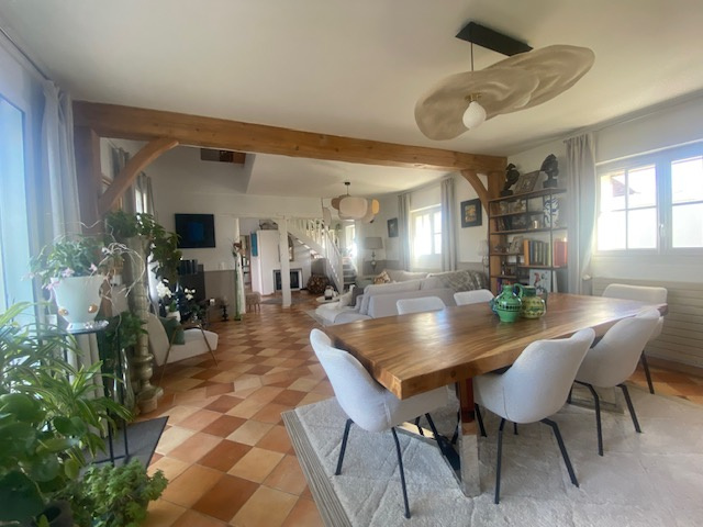 -Au RDC: Entrée avec placard, salon avec cheminée insert, séjour, grande cuisine équipée donnant sur terrasse, 1 suite parentale avec terrasse donnant sur le jardin, dressing, salle d'eau-wc, 1 chambre donnant sur le jardin,1 wc.